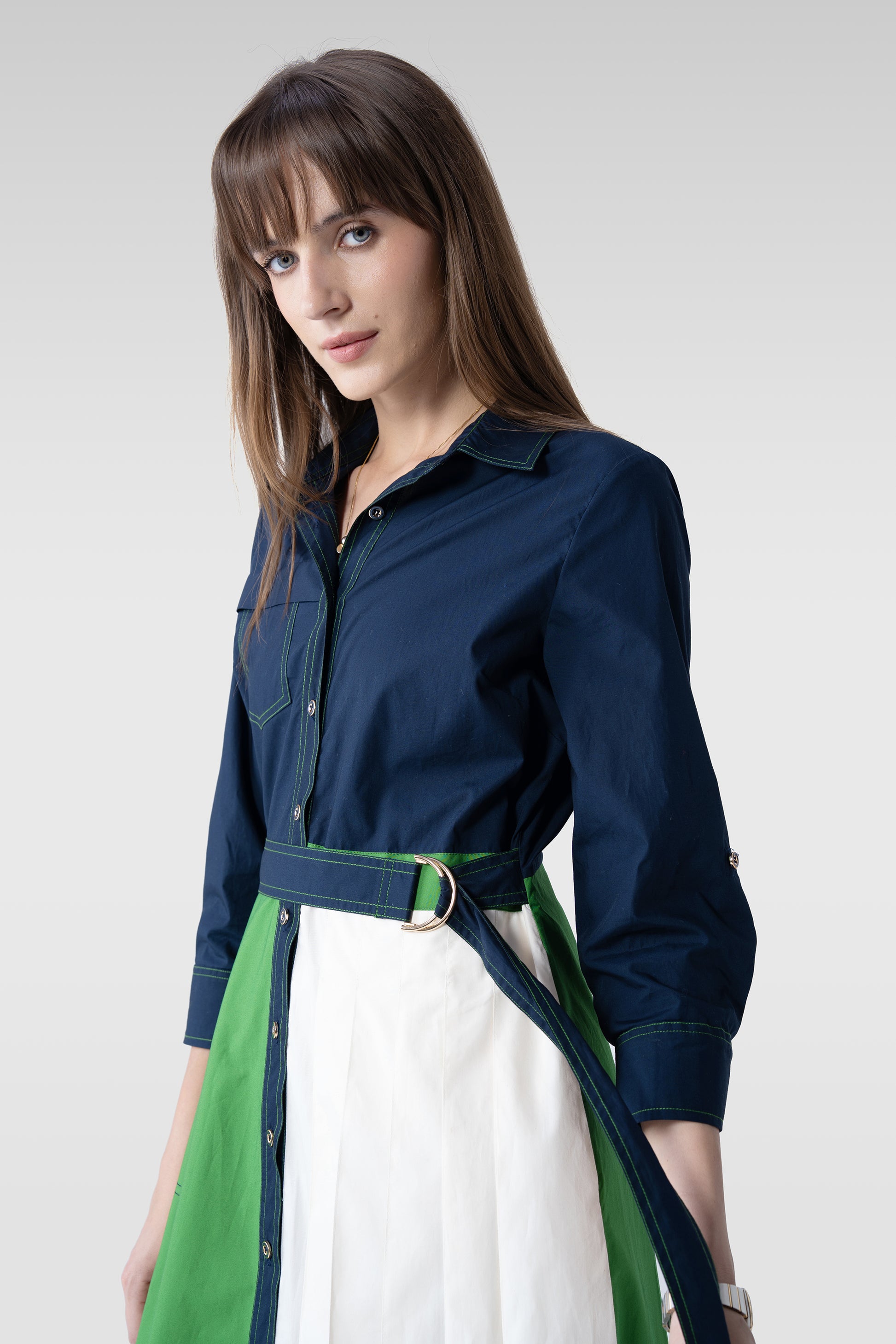 A Dialogue signature that redefines modern workwear, the Kaizen Dress is crafted in breathable cotton satin and designed with sharp tailoring softened by fluid pleats. With its shirt-collar silhouette, button-down front, and one-sided contrast pleats, it strikes the perfect balance of structure and ease.