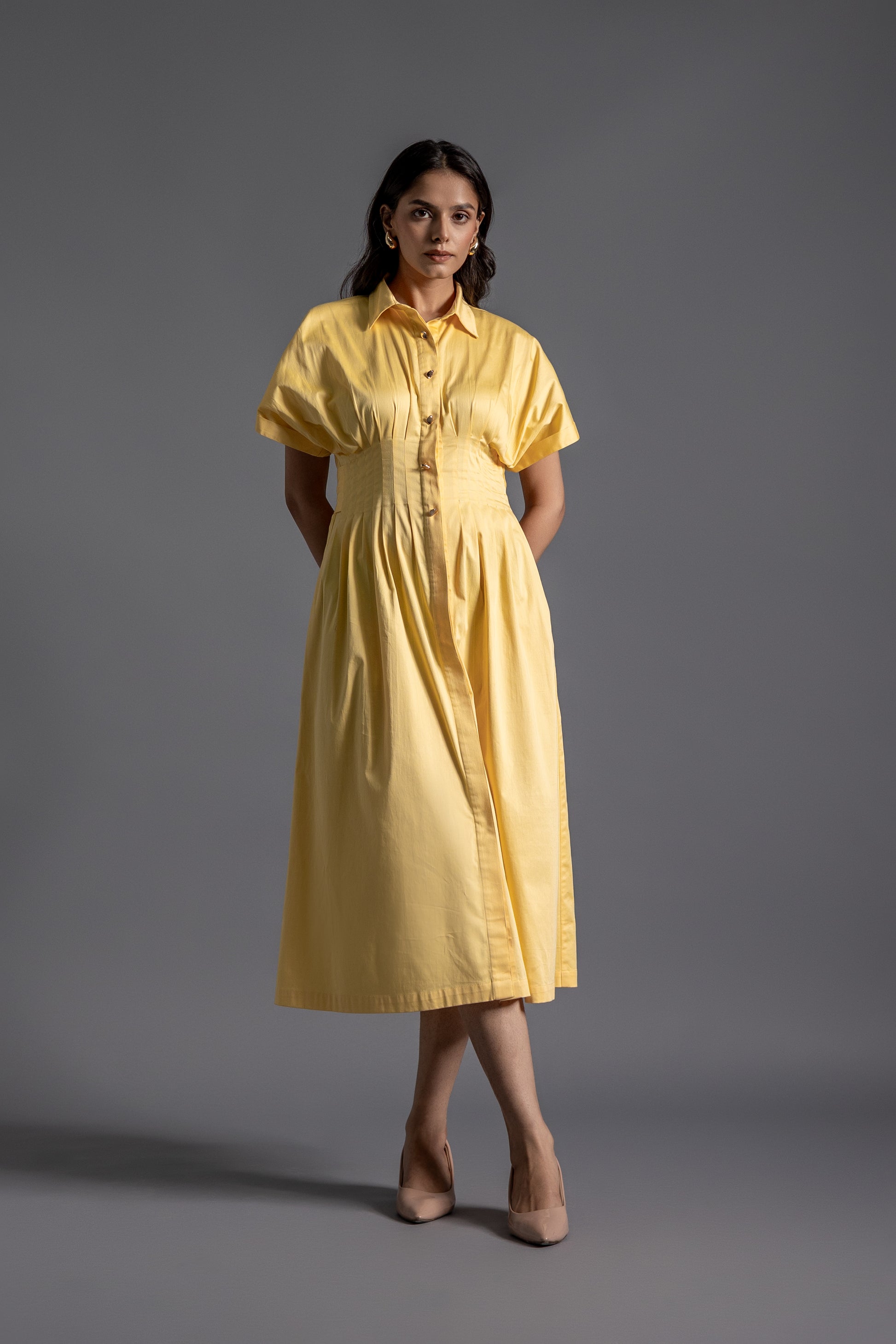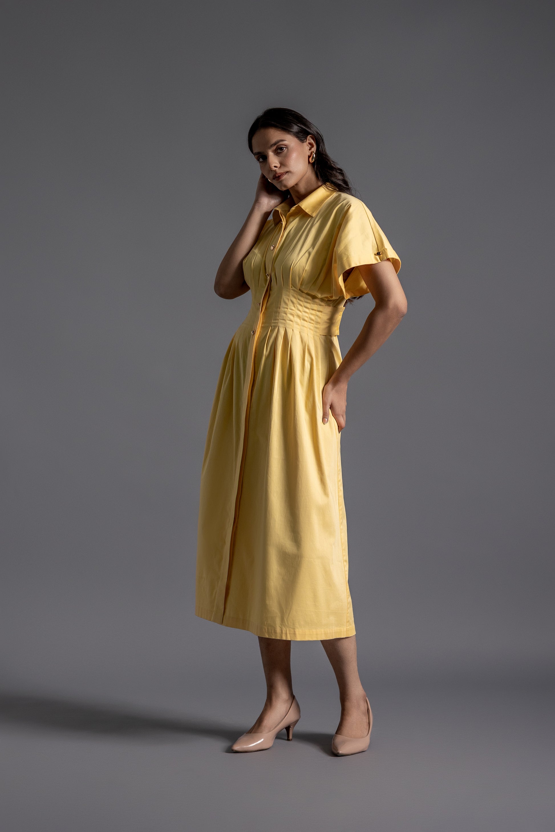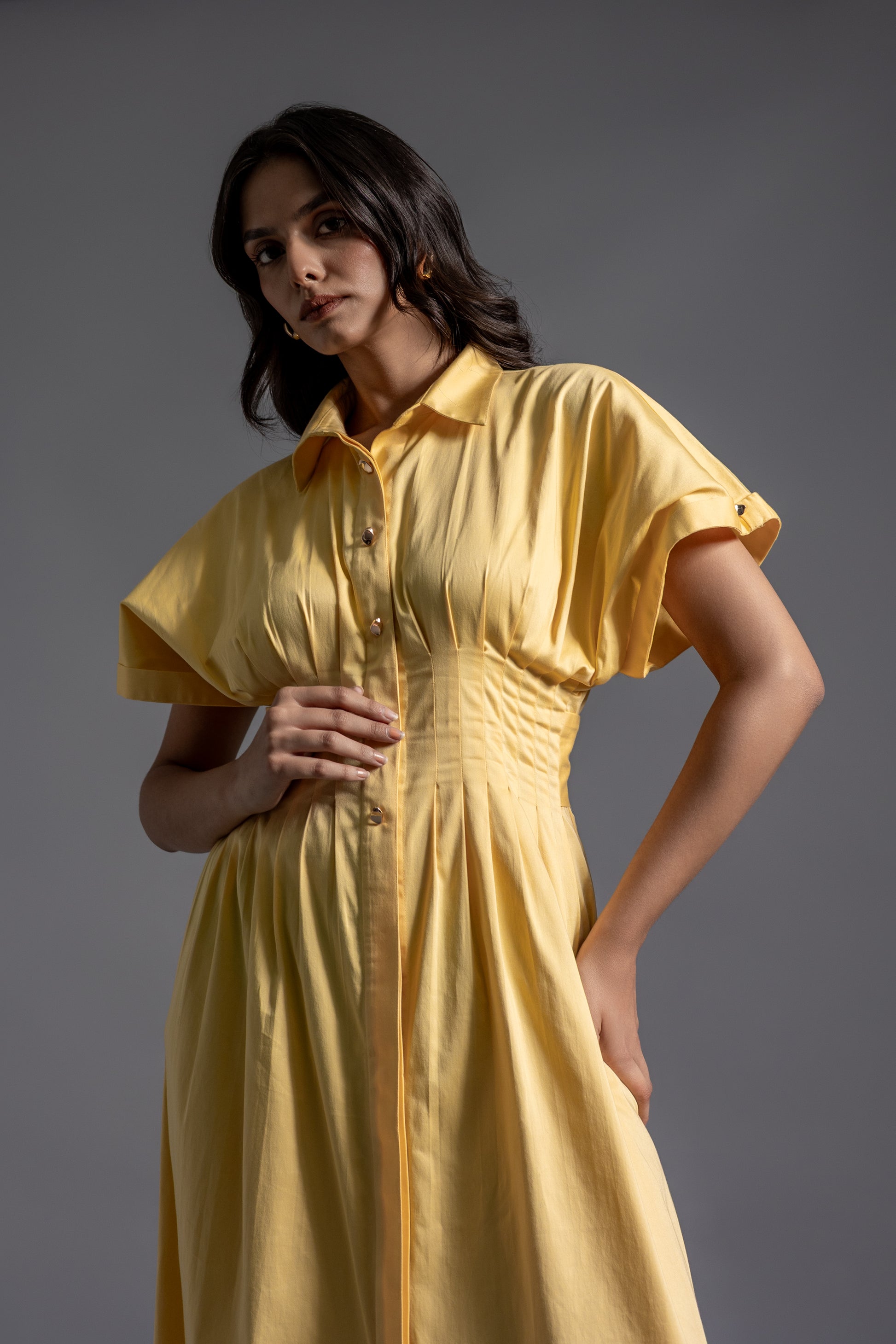 *Shirt dress with collar *Button front with hidden placket *Batwing sleeves *Pleats at waist *Side seam pockets *Side tabs with option to adjust waist width *Metal show buttons