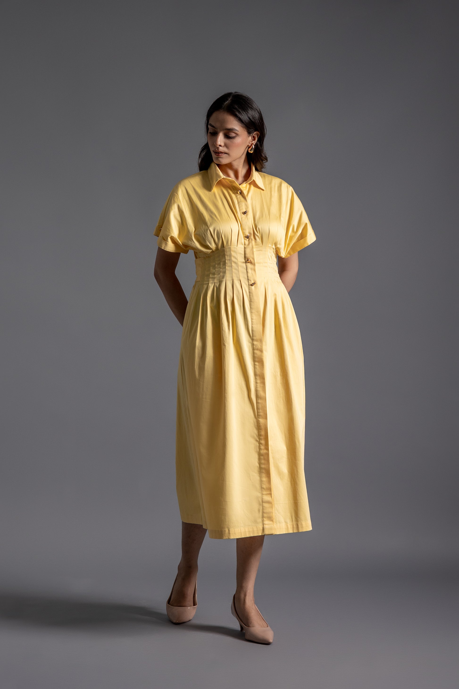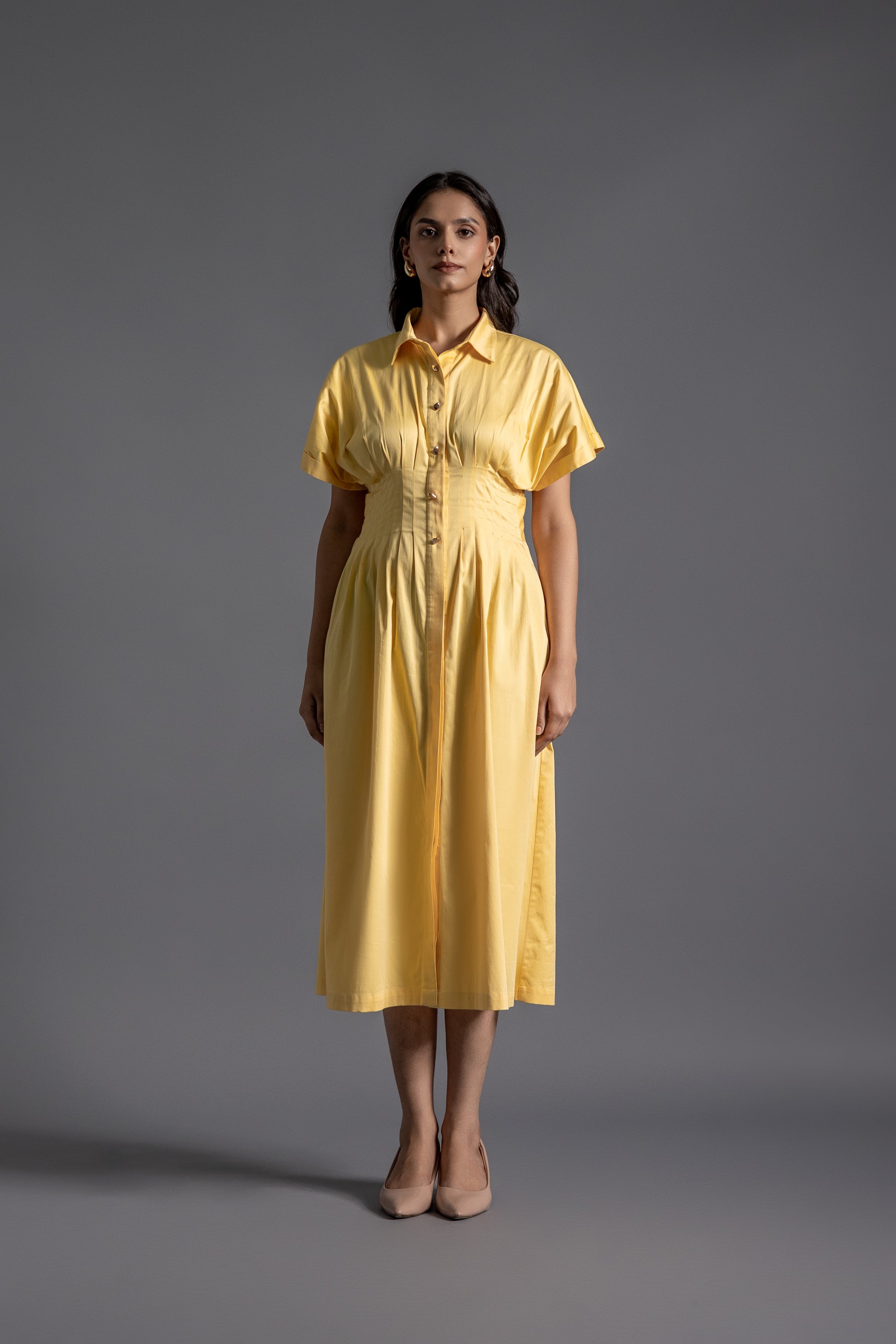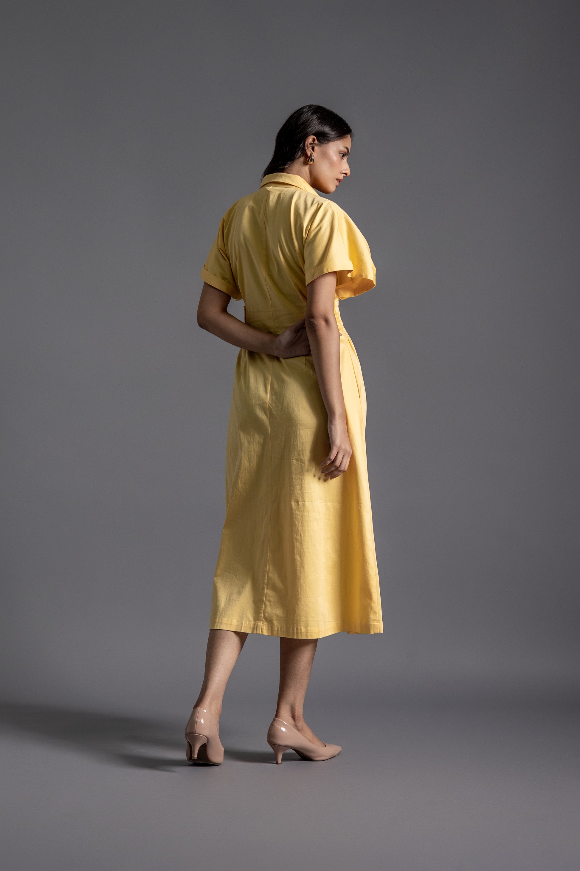 *Shirt dress with collar *Button front with hidden placket *Batwing sleeves *Pleats at waist *Side seam pockets *Side tabs with option to adjust waist width *Metal show buttons