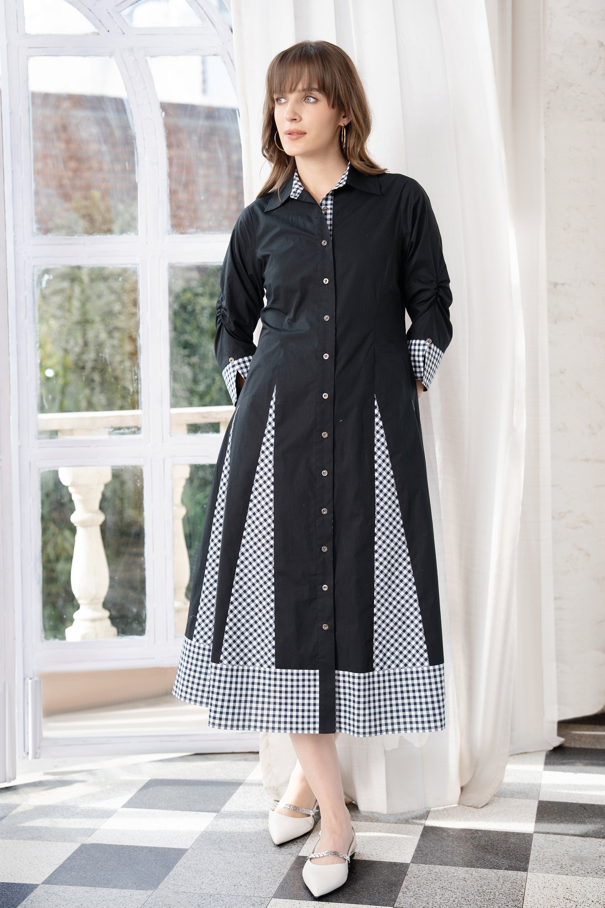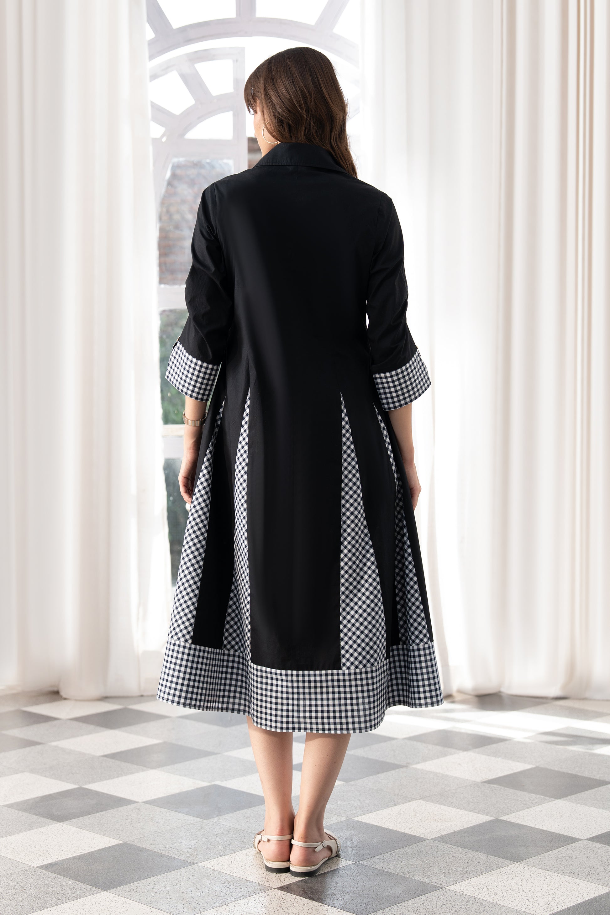 Made in 100% cotton poplin, it holds structure while remaining light and breathable. The tailored shirt collar and button-down front lend it a sense of sharpness, while princess paneling shapes the body through the waist for a flattering fit. The silhouette opens into a midi length with godet detailing that introduces movement and flow.