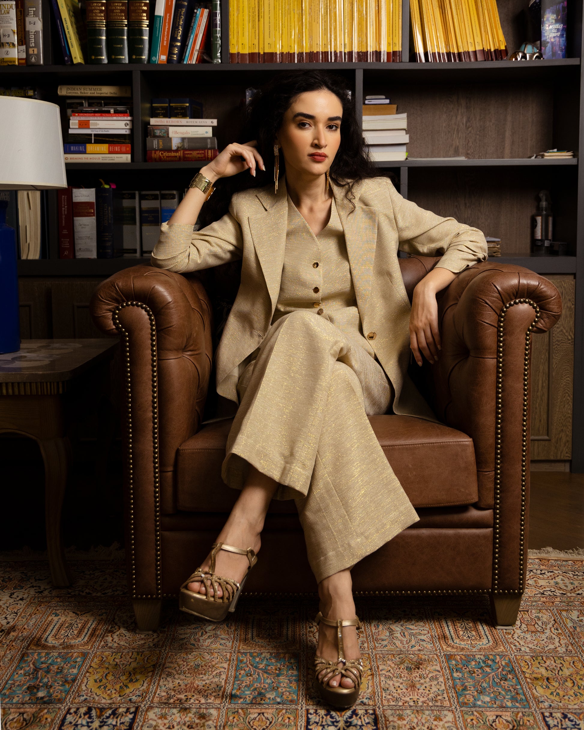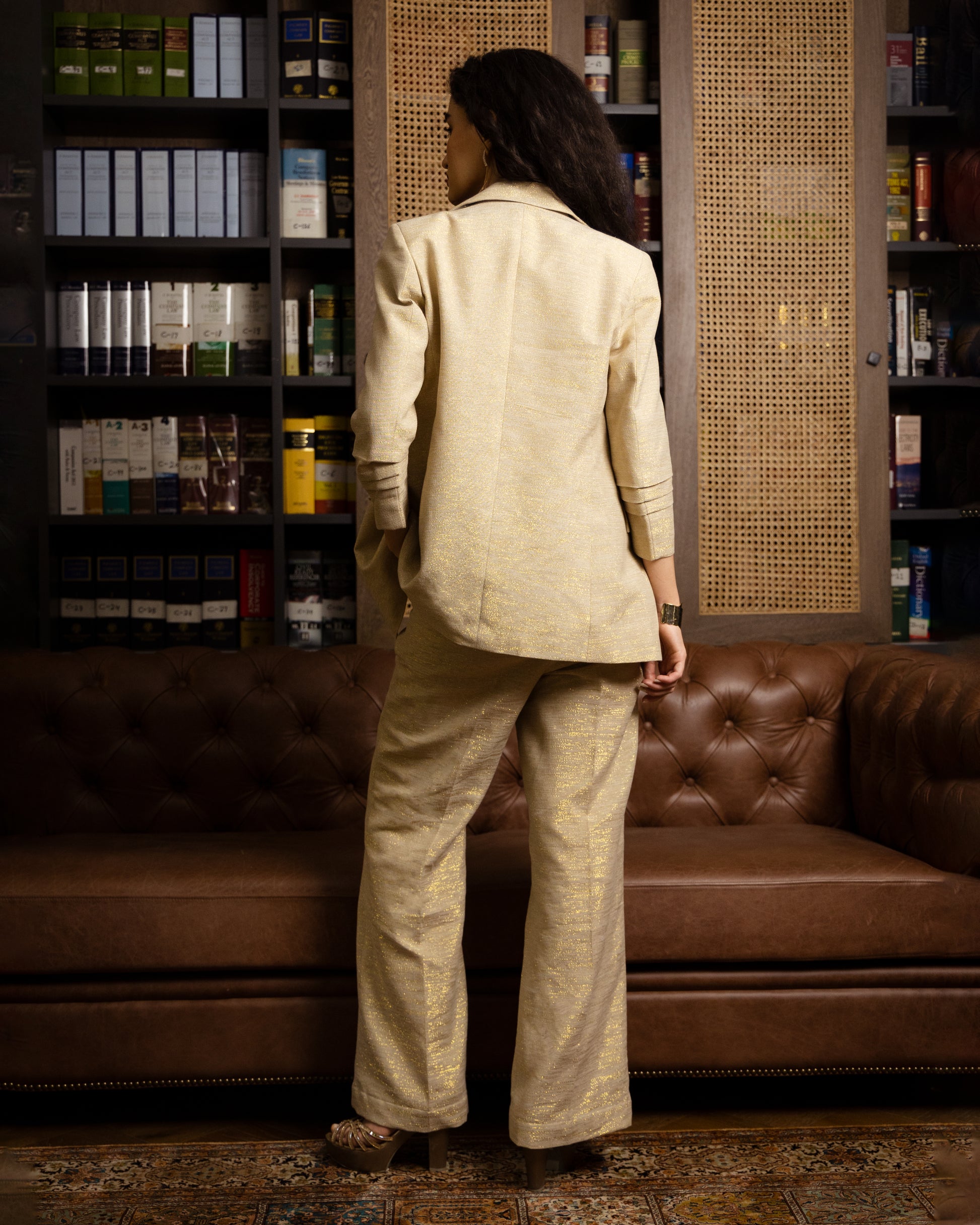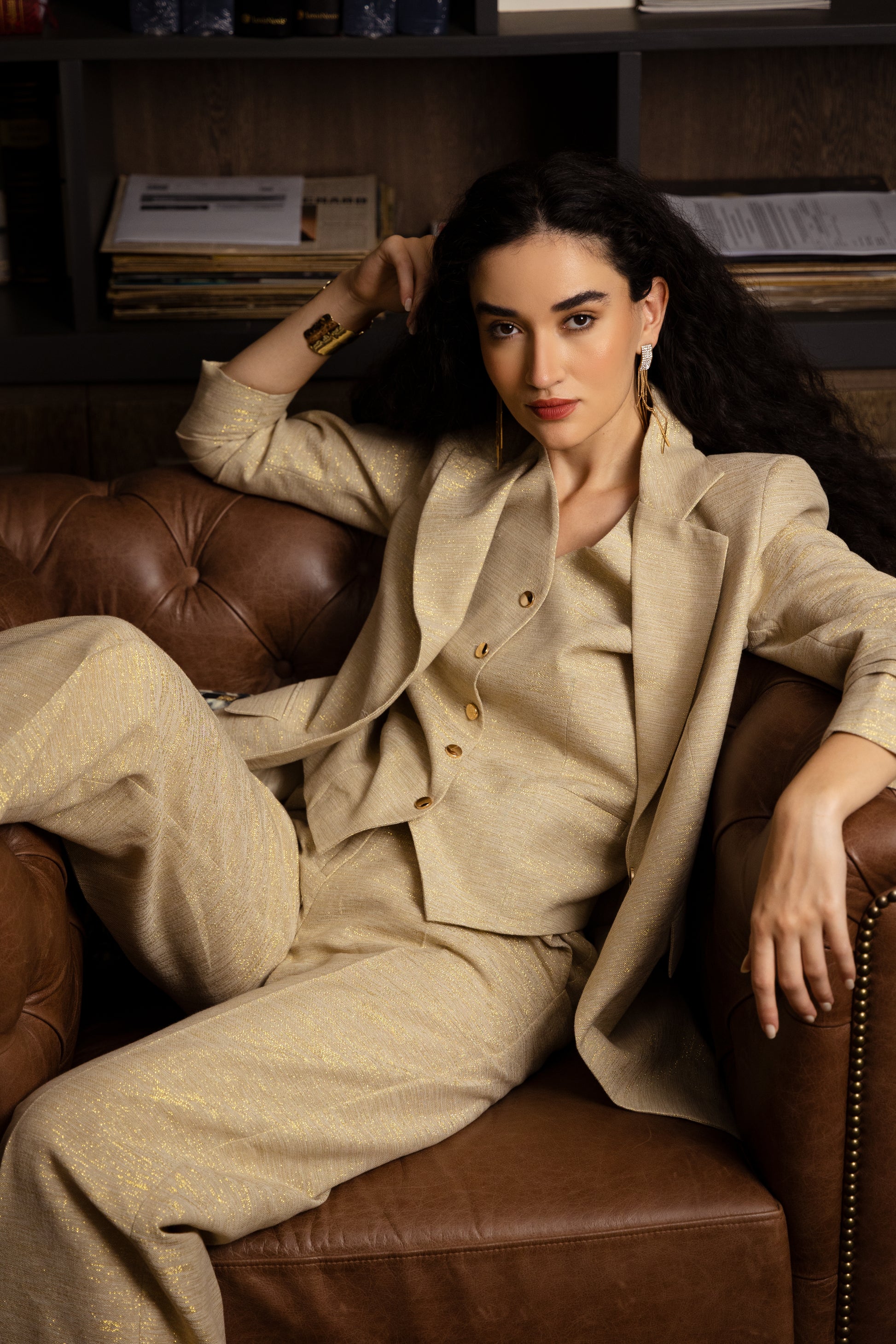 Where quiet luxury meets effortless glamour. The Noor Blazer is a study in understated elegance—crafted from pure cotton woven with delicate gold lurex threads that catch the light in just the right way.